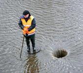 Там, наверное, над самой поверхностью 2 плоскости какого-то прозрачного материала (оргстекла, например). Белый с него скатывается, а красный уходит под воду когда одну из плоскостей топит мужик!