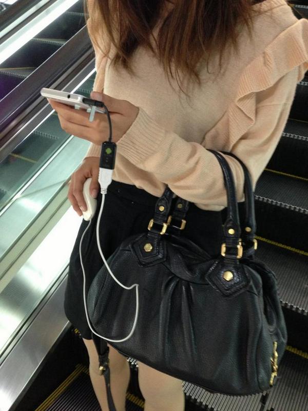 В метро девушка, у которой видимо, перестал работать тач-скрин на смартфоне, нашла выход из положения - присоединить мышку через USB-переходник. В качестве коврика для мышки она использовала свою юбку. Как можно видеть, этот способ вполне функционален, даже с сумкой на второй руке.