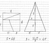 Это, батенька, не теорема, а оптический обман зрения, потому как у большого “треугольника” боковые стороны не прямые. У них есть излом (внутрь) в точке сопряжения трапеции и маленького треугольника. Любой желающий может в этом убедиться, нарисовав сие чудо на листике бумаги в клеточку 😛 . Так что у нас не треугольник, а пятиугольник с площадью в те-же 64 клетки.