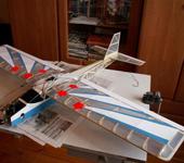 Седня мой самолет первый раз поднялся в воздух. Ну, старший научный руководитель 😃 сделал один полет, посадили, заправили, завели, взлетели. Круг пролетели без проблем, потом смотрю, что-то Олег (старший 😃 ) тянет пульт с полностью отклоненным вниз рулем высоты. Самолет летит горизонтально. Ну, секунды 3 мы смотрели, как он летит, потом я пошел доставать его из сугроба. На полном газу, на большой скорости, в самостоятельном полете самолет встретился со снегом. Снег такой плотный, сантиметров 10 всего. Из поломок: только винт и задняя кромка крыла в месте встречи с фюзеляжем (треснула она, эта кромка). Причина: открутившийся винтик качалки и слет последней. И при этом целый самолет! 😃