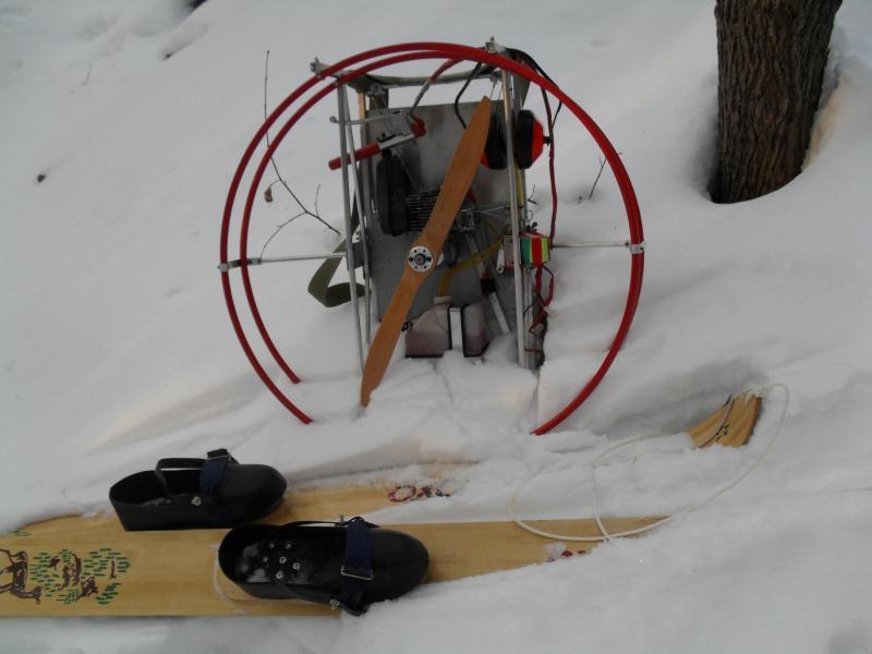 Чистый “колхоз” - собрал за недельку в зимние каникулы 2008-2009 - “между салатом и другими игрушками” - профиля из хозмага и авиамодельная мелочуга. Мотор брал в Москве. Тягу не мерил. Винты 24х8, 24х10. Для “правильного” снега (-10-23С, снег старше 3-х дней) хватает - “глаза на выкат” (пару раз падал - тьфу-тьфу - только-б, не “кубарем” и не на спину) - в оттепель охотничьи деревянные лыжи мокнут, не скользят - позор один…