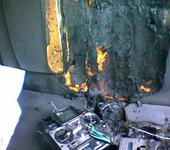 В итоге сгорела левая половина заднего сидения, потолок, пластик потолка, задняя полка, центральный ремень безопасности, ручки на крыше, обивка задней левой двери, солнечные козырки расплавились. А также самолёт Super Zoom 4D, зарядник и передатчик.