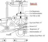 И там же в FAQ: Can I use the built-in pitch gauge on my Raptor 30? Yes, if you first set the two long links (pg. 12, step 12, item 4) to 100mm. This might very slightly from 100mm to 102mm so to get a perfert match you would have to use an accurate pitch gauge placed on the blades and set to 0. Then move the pitch arm to align with the 0 center mark. Then adjust the links to get the blades set at 0 degrees.