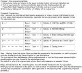 Включите передатчик, передвиньте стик газа на максимум. Подайте питание на регулятор. Регулятор начнет издавать сигналы (повторяя каждый 3 раза) типа: музыка-1бип, музыка-2бипа, итд. Каждый сигнал соответствует своей группе настроек. Для того, чтобы выполнить настройку переведите стик в среднее положение когда услышите нужный сигнал. После этого контроллер начнет проигрывать “морзянкой” варианты настройки для данной группы. Когда услышите нужную последовательность “точек” и “тире” переведите стик снова на максимум. Длинный “бип” подтвердит сделанные изменения и контроллер снова начнет перебирать группы настроек. Когда настроите все группы что хотели - переведите стик на минимум. Данные запишутся в память и контроллер перейдет в нормальный режим.