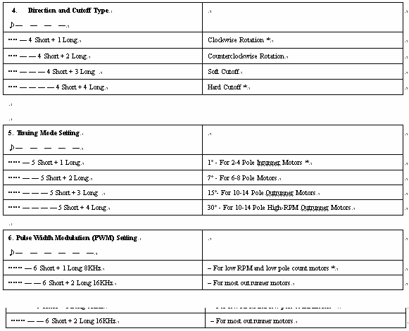 (beep - это длинный гудок, а троеточие - пауза). С этой прошивкой настраивается всего две опции: тип аккумулятора LiPo/NiMH и вкл/выкл тормоза.