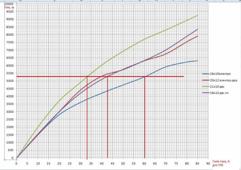 В последствии Винт был выбран 20х10, а в аппаратуре установлено ограничение по газу такое, чтобы ток не превышал 85А при максимальном отклонении стика газа.