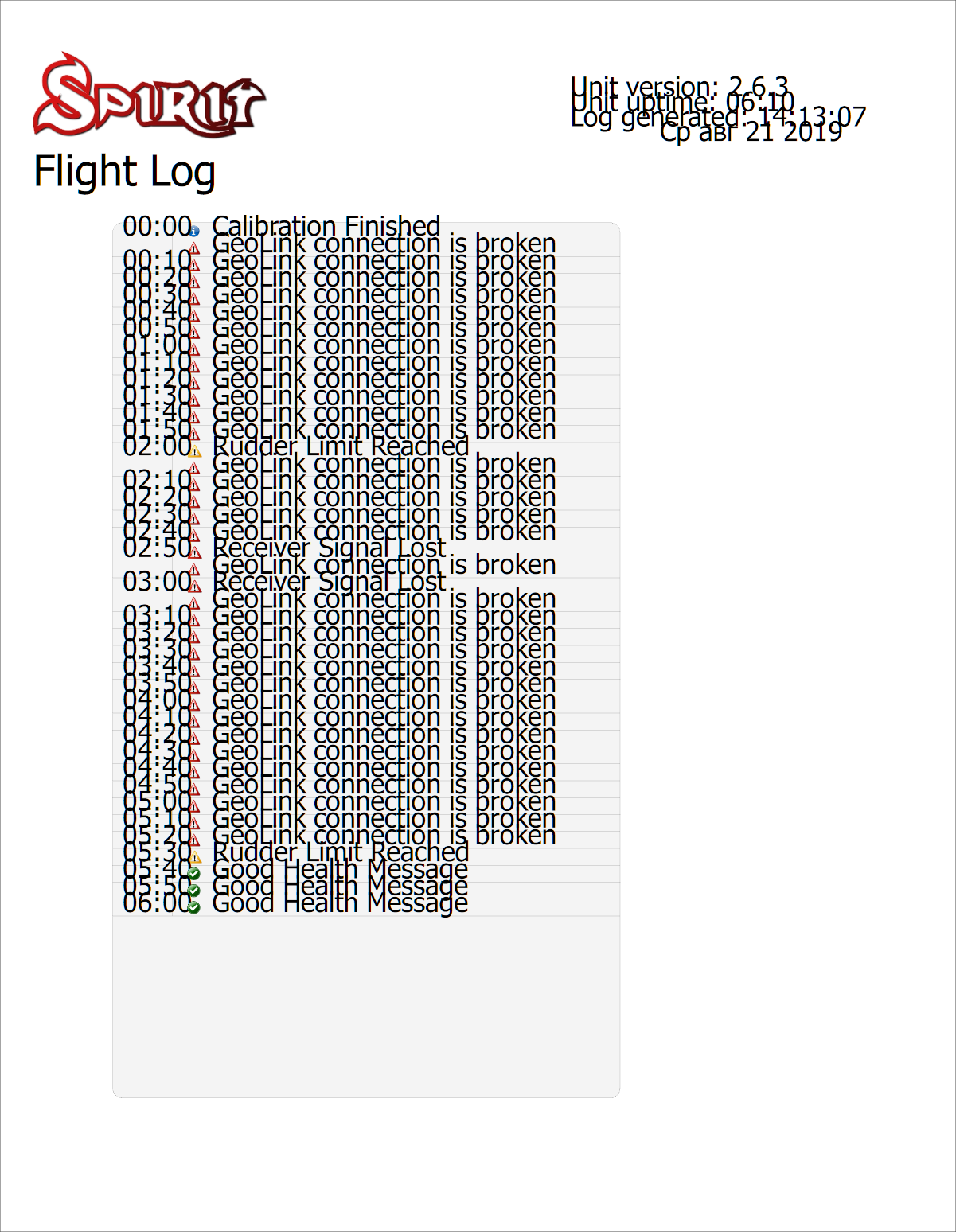 Во-первых в лог не записался FS, не записались лимиты хвоста, да и про геолинк ни слова. Но лог записался, как предыдущий. То есть что-то спирит видит не так, но в лог не записывает. В общем я получил 120 секунд Good Health, когда реально за это время выключал аппу. Потом тестировал, тестировал и еще раз тестировал. За все время еще раз поймал такое поведение 2 раза. То есть тупо управления нет, в логах чисто. Вырубал даже ресивер, а в логах все равно чисто.