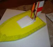 На этой модели я тоже предусмотрел возможность прикручивания гидро руля к основному на болтах. Но после первого же запуска я его снял за ненадобностью. С такой лопатой может крутить пятаки и на полной скорости, а на малой подавно. Моё мнение большая площадь и возможно ближнее расположение к центру будут влиять на управляемость. Но и корпус здесь килеватый.