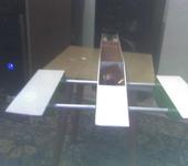Корпус модели сделан из бальзы с стеклотканью кроме транца и подмоторного шпангоута они сделаны из фанеры 4 мм все остальные шпангоуты из бальзы 4мм,боковины из бальзы 2,5мм. Поплавки наборные из бальзы 2,5мм.Руль вырезан из алюминиевой пластины 4мм