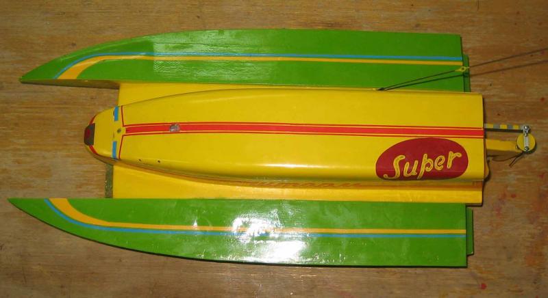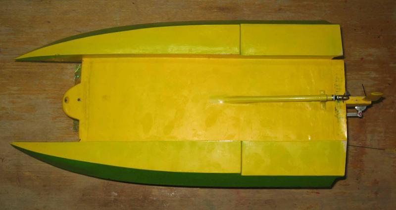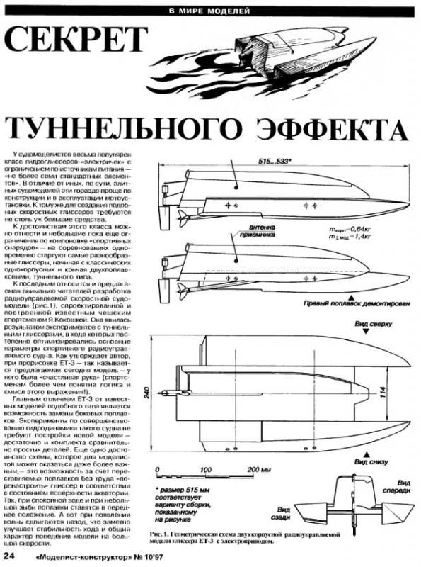 Центр тяжести модели должен быть примерно на уровне поперечных реданов поплавков (± туда сюда 10-15мм). С такими настройками, я думаю модель должна бегать по лучше. И еще одно, от компановки силовой установки которая показана на чертежах в журнале М/К - надо однозначно отказаться. Она расчитана под полностью погруженый режим работы винта, а с настройками указанными выше модель длжна работать с полупогруженным винтом. Тоесть винт должен быть за транцем модели на определенном расстоянии, а не под корпусом модели. Из выше перечисленного следует, что мотор должен находится в задней половине корпуса , а аккумуляторы в передней части корпуса, т.е. как на моделях класса ГИДРО.