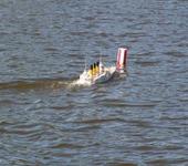 первый кораблик был утоплен в этом году во время Первенства Самары среди школьников - причины: отказ аппаратуры + наезд гребной лодки с отдыхающими (которые не сумели отвернуть от модели). Пролежал на глубине 4 метров пару недель, после чего был поднят доблестными водолазами из МЧС. Состояние после подъема удовлетворительное, из аппаратуры “потерян” только приемник, остальное работает, даже аккумуляторы еще “дышат” - после перекраски, снова в строй!