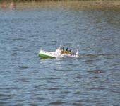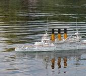 первый кораблик был утоплен в этом году во время Первенства Самары среди школьников - причины: отказ аппаратуры + наезд гребной лодки с отдыхающими (которые не сумели отвернуть от модели). Пролежал на глубине 4 метров пару недель, после чего был поднят доблестными водолазами из МЧС. Состояние после подъема удовлетворительное, из аппаратуры “потерян” только приемник, остальное работает, даже аккумуляторы еще “дышат” - после перекраски, снова в строй!