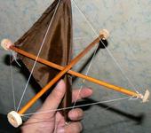 Одна из осей играет роль мачты, другая - роль гика, установленного вдоль корпуса. На них натянут треугольный парус и предполагается, что часть этого же паруса, находящаяся под водой, будет играть роль киля.