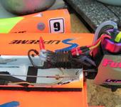 Вопщем переделал самолетный регуль в лодочный - сверху на термопасте прилепил кусок аллюминия 5мм толщиной чуть больше регуля, и поверх этого самопального радиатора приделал тонкую трубочку нерж опять же на термопасте, изогнутую U-образно. Аккумулятор на Small Bolt поставил 1000мАч, 25-35С Турнига. Сперва задвинул в самый нос почти - лодка никак на глиссирование не выходила. Потом подвинул назад - стала выходить но с трудом секунд 5 гдето. Но зато потом носится как ужаленная, прыгает на волнах. ))) Аккумулятор слабоват - откатал минут 5 на нем до разрядки - достаточно горячий, но рука терпит без напряга. Надо регулировкой дейдвуда поиграть, чтобы порезвее выходила на глиссер. Сейчас дейдвуд поднят по максимуму вверх. Моя превая лодка, сравнивать не с чем, но доволен! Напряжно только при замене аакумулятора отдирать скотч, и повторно заклеивать…