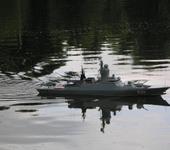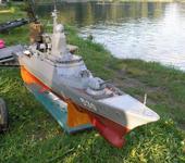 Длина у модели корвета 1650. Масса около 9 кг. Размеры рулей 30 на 30 взяты с общего вида корвета. Максимальные углы отклонения до 30гр. Недорогой гироскоп с каналом отключения его работы. На гироскопе есть два потенциометра для регулировки чувствительности. При прохождение через волну от катера спасателей, они специально увеличивают скорость в момент пересечение курса, подыгрывая модели, можно разрешить модели или пройти практически ровно или долго раскачиваться с бортовой качкой. О влиянии скорости на реакцию модели было уже сказано.