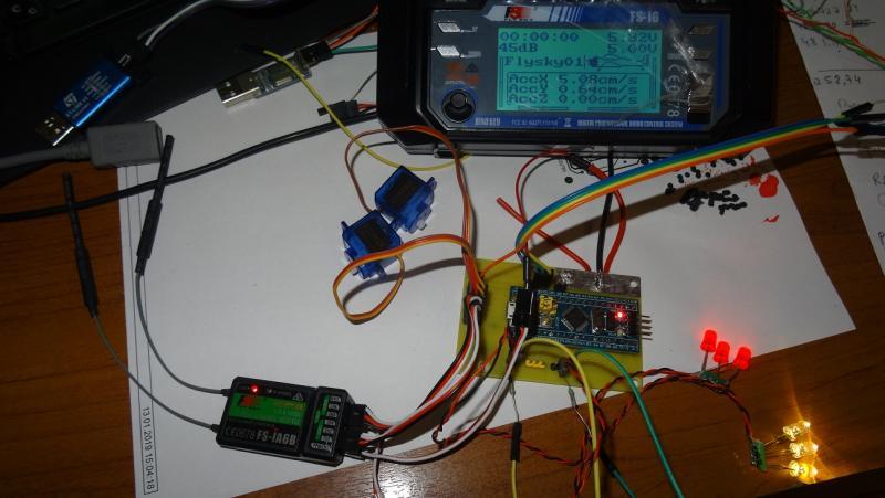 Дополнил схему модулем навигации ( гира+аксель+компас), датчиком температуры и еще двумя выходами на сервы.