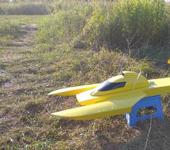 Видно, что струя залетает на палубу ближе к корме и летит прямо в мотор. Появилась мысль сделать небольшую боковую площадку ,примерно в том месте где залетает вода. Примерно от кормы до середины участка на палубе, короче не на всю длину от поплавка. Шириной примерно 50мм. Может поможет.