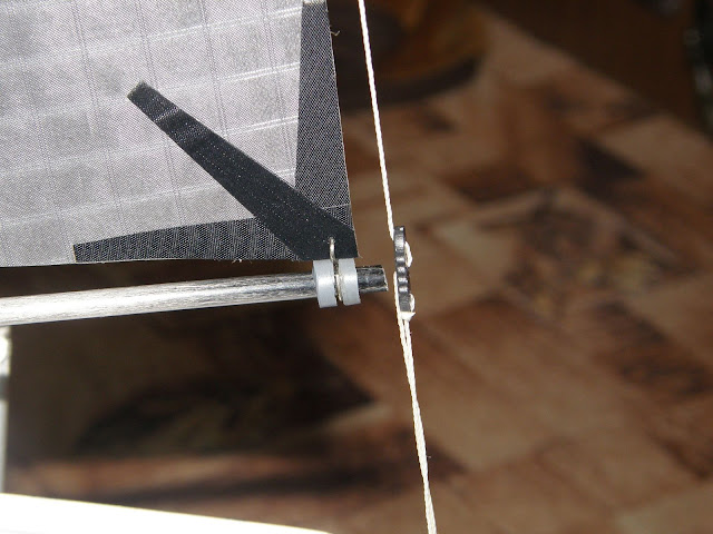форштаг оставлю, т.к. оттяжка на стакселе пока не зафиксирована как положено, она проходит в гик, выходт сбоку, проходит через люверс, обратно ныряет, выходит через перед и фиксируется за резинку, т.е. она же держит и парус. т.о. получается при излишнем натяжении оттяжка будет резать люверс, форштаг сейчас немного компенсирует избыточное натяжение и стаксель достаточно свободно крутится и без грузика 😃