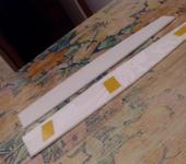 Вот первый ляп. Чтоб одинаково опилить шкуркой детали борта прихватил их по парно двусторонним скотчем, и перестарался. Приляпал аж в трёх местах слишком большие куски скотча из-за чего не смог потом их окуратно разъять. Снова вырезал детали борта и уже прихватил их малюсинькими кусочками скотча, и всего лишь в двухместах.Второй раз благополучно разъял заготовки.