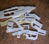 «Предвестник» делался на тех же шпангоутах что и «Призрак» обрезанных снизу на 3 мм, а обшивка, из листов 7 мм “Styrodur”-а, после чего корпусу с помощью наждачки придавались скруглённые обводы, естественно на глазок, главное чтобы было «симметрично криво» (занятие утомительное, пыльное, и совсем не интересное). Конечно, с самого начала было ясно, что эта не та технология, но и задача стояла просто испытать материал. Когда корпус был готов, оказалось что с ним надо обращаться очень аккуратно и не смотря на свою «герметичность» без обтяжки корпуса скотчем не обойтись, что как не странно оказалось не такой уж проблемой. Накладки скотча конечно побольше, но и оклеивается без морщин.