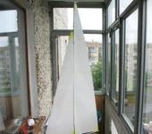 По парусам мало информации, точнее по самой сборке. Теперь понял, почему пленка должна быть достаточно тонкой. Свою купил в цветочном магазине и клеил каким-то китайским двусторонним скотчем ( правильно писали, что надо 3М) . На швах кое где появились отлипы, пришлось дополнительно клеить канцелярский скотч, а это как я понял плохо. Профиль паруса становится жестким и плохо продавливается в противоположную сторону от действия ветра. Кромки парусов тоже усилил тонкой полоской, но как сам понимаю, что этого делать не стоило. «Переусилил» углы , теперь полотно плохо держит профиль снизу.
