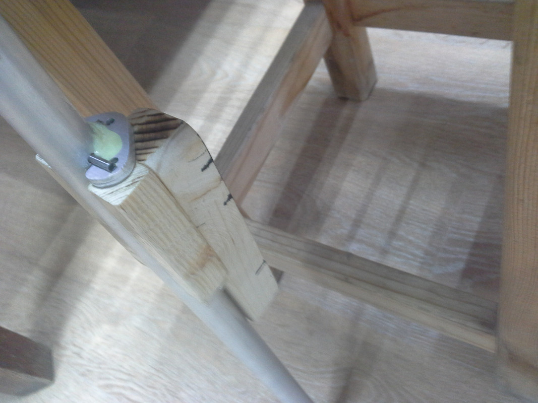 Шарнир гика решил сделать из хомута какого-то, одна ось шарнира алюминевая трубка с пластиковыми колечками в роли подшипников мягких
