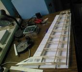 У меня нервюрки из 3-х мм бальзы. Вес скелета одной половинки крыла 52 грамма. + планируемый вес скелета элерона 10 грамм. Плюс обтяжка изополином и раскраска пленкой = 45 грамм. Получится 107 грамм на консоль. 214 грамм все крыло + 16 грамм труба = 230 грамм послностью собранное крыло.