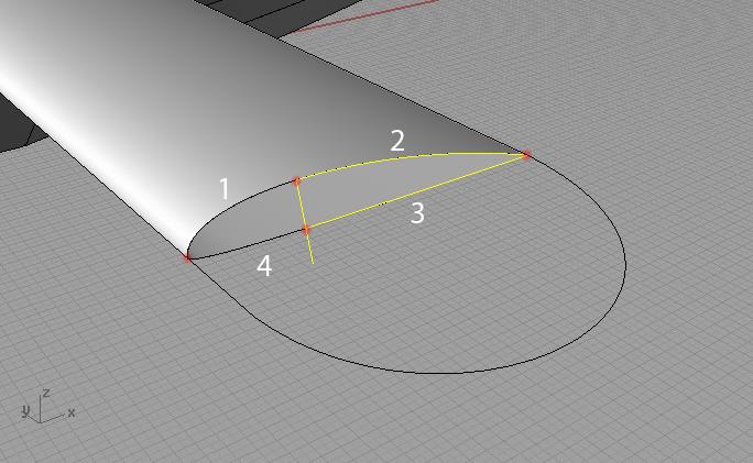 Известно,что две кривые могут образовать только поверхность первого порядка((одинарной кривизны)если это не поверхность сдвига с вращением).Подобная форма законцовки характерна для самолётов с мягкой обшивкой.Такой подход конечно возможен в нашем случае,если конструктор сознательно идёт на определённую степень упрощения форм.Но рассмотрим всё таки вариант построения поверхности второго порядка. Для её создания нужна третья кривая.Чаще всего такую кривую делают в виде продолжения лонжерона,но я поступлю иначе.Кривая ,образующая обводы профиля рассекается в своей наивысшей точке на две части
