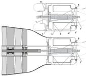 с промышленного двигателя крыльчатка 1 снимается, статор-2 оставляется, диффузор 11 тоже выкидывается! К статору прикручивается направляющий фланец, в нём сидит задний подшипник компрессора, передний служит больше для стабилизации. Спрямительная система крепится к кожуху.