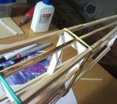Вроде бы все состыковалось и ровненько. Вот только рейки надо было предварительно рубаночком подогнать, особенно в хвостовой части, что бы они не выступали за контуры шпангоутов. Похоже по наличию капель на стыках - ты уже его проклеил. Теперь подогнать рейки - будет сплошной геморрой . Во первых шпангоуты изуродовать - не фиг делать . К тому же из-за гибкости и пружинения стрингеров они будут при такой обработке по месту - как сосиски. То есть из-за отгиба внутрь при обработке они потом посередине между шпангоутами будут толще и потом будут выступать наружу волнами. И похоже фанерные боковинки носовой части ты тоже не сошкурил на нет в месте их стыка со стрингерами - это уж точно теперь по месту - хрен сделаешь. А я ведь на этом акцентировал внимание, когда описывал порядок сборки.