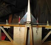 Ну конечно нет. Зачем такая высоченная. Это какой же длины надо брать болты, что бы привинтить стойку?, На чертеже она нарисована, причем даже с преувеличением. Я делал на 3-5 мм выше центровочных отверстий. Причем отверстия в болванке сверлил НЕ В СБОРЕ, а отдельно потому что они чуть большего диаметра, т.к. когда снимаешь крыло его немного наклоняешь вниз и штыри могут заклинить. А по длине делал болванку на всю длину от шпангоута 3 до шпангоута 2, и возле этого шпангоута в ней же сделал радиусный выход канала охлажения .Только болванкутоже приклей и к боковой зашивке, Так как зашивка у тебя уже пришпандолена, и широкую болванку уже туда не втулишь, то просто засунь по бокам кусочки бальзы (твердой) или липу. И не забудь до вклейки болванки просверлить отверстия под болты крепления стойки насквозь и вставь на клей с обратной стороны грибки с резьбой.