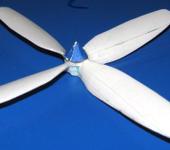 😃 Это не картон. Это трехслойный пирог из 2-х мм пластика, укрепленный циан-акрилатным клеем в несколько слоев. Слои там видны. Толщина лопасти в рабочем диапазоне диаметров 0.5мм, у корня - симметричный 2.5мм, профиль выпукло-вогнутый… делал на глаз, по-быстрому. 4-х лопастной винт сделать легче чем 3-х и балансировать проще. С расчетом, получилось за пару часов…