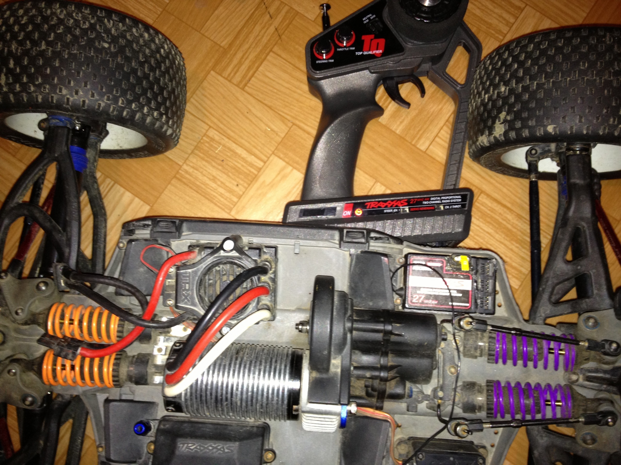 Питание приёмника с разъёма от регуля идёт. Регуль во 2-ой канал, серву в 1-ый. Коробочка с надписью Traxxas - это герметичный радиобокс, чтобы водой и снегом приёмник не залило.