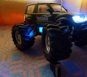 Кому рассказать не поверят, зависимая подвеска обоих мостов, маслянные аморты от 8 масштаба, привод полько на зад. Установлен мотор Б/К 2200 , регуль 150А китай. 3 баночный липо, 2.4 Ггц аппа, от игрушки остался кузов редуктор задднего моста, сттупицы передние и 4 колеса. Сделано за 5 дней, бюджет 9 000 рублей.