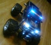 Кому рассказать не поверят, зависимая подвеска обоих мостов, маслянные аморты от 8 масштаба, привод полько на зад. Установлен мотор Б/К 2200 , регуль 150А китай. 3 баночный липо, 2.4 Ггц аппа, от игрушки остался кузов редуктор задднего моста, сттупицы передние и 4 колеса. Сделано за 5 дней, бюджет 9 000 рублей.