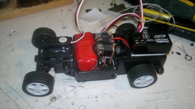 Нашел у сына сломаную китайскую игрушку масштабом 1/24 с дискретным управлением. Пульт давно утерян, лежит - пылится. Решил заморочится не ради результата, а ради процесса. Собрал из того, что было в наличии. Поставил моторчик от киошо мини-з, коллекторный регуль от Бронтозавра 1/10, сколхозил спайку из 4-х акков racing power 1000mAh, микросерву, приемыш футабовский. Машинка заднеприводная, если курок резко нажать разворачивается на месте. По ковру, не давая полный газ, кататься можно.