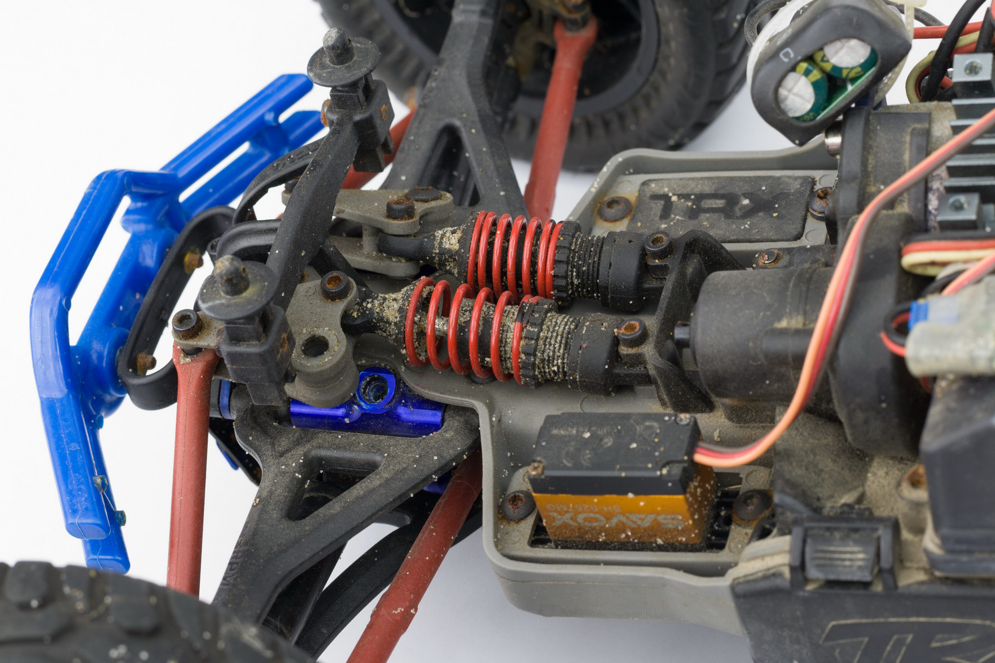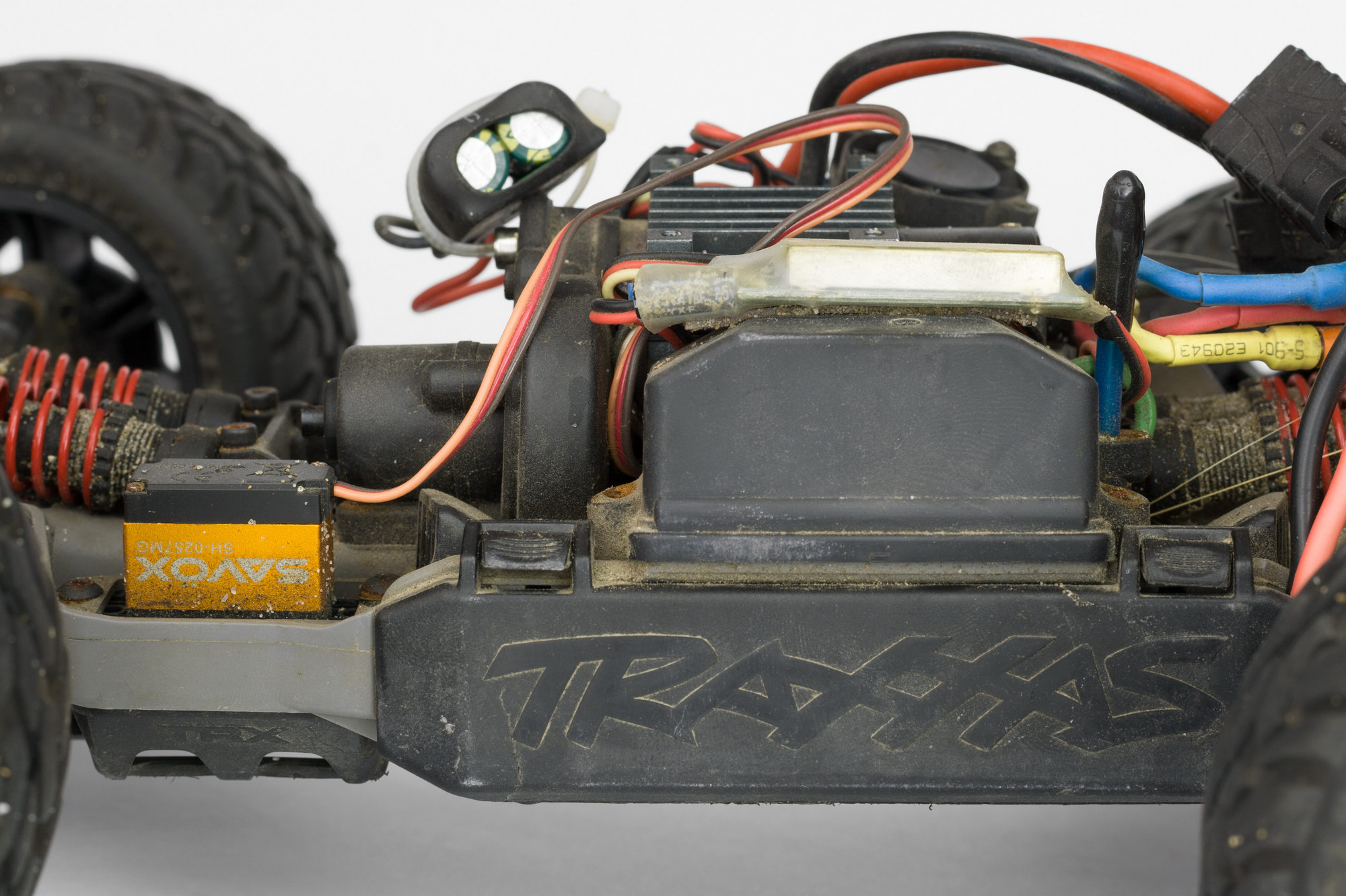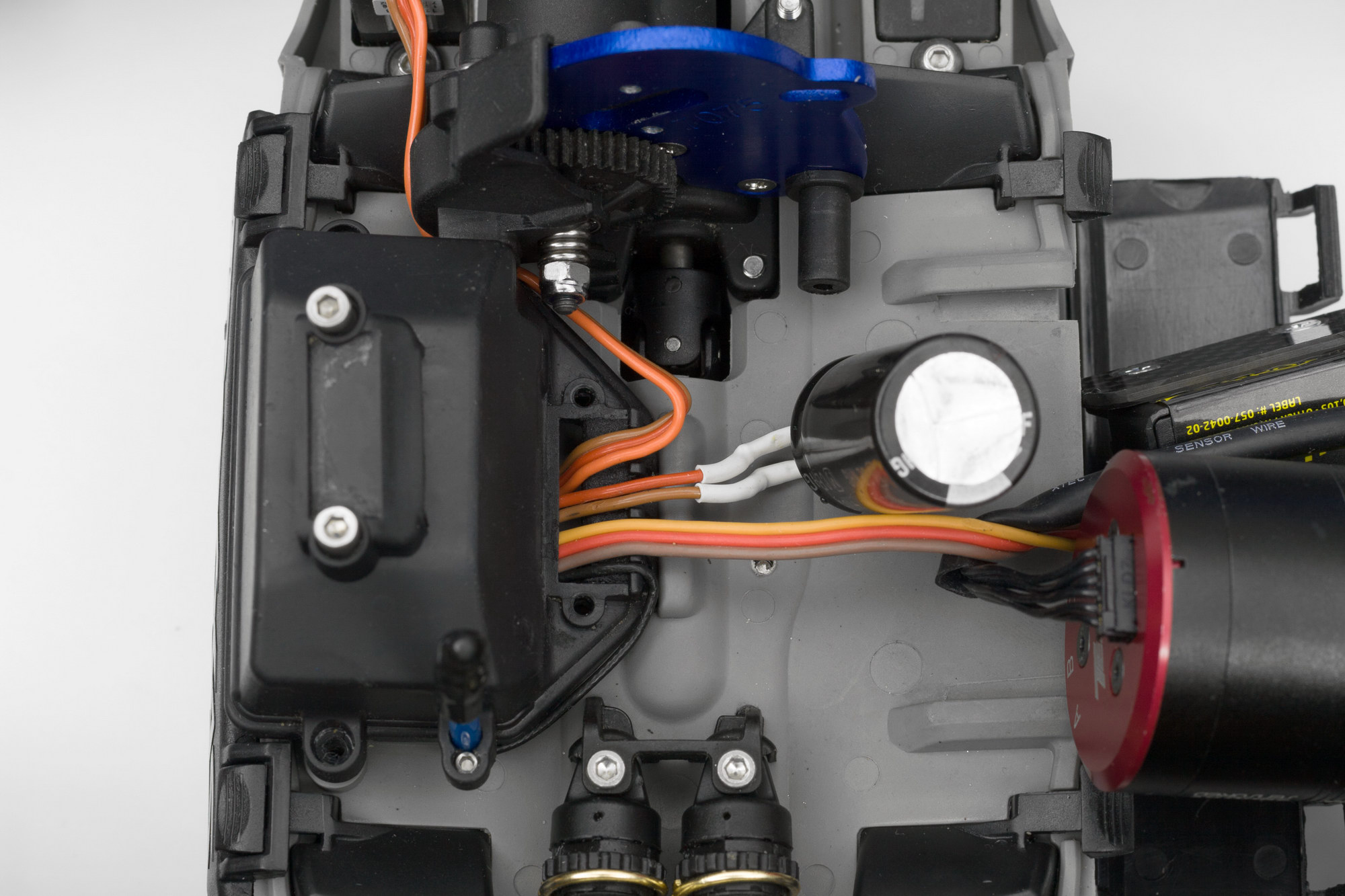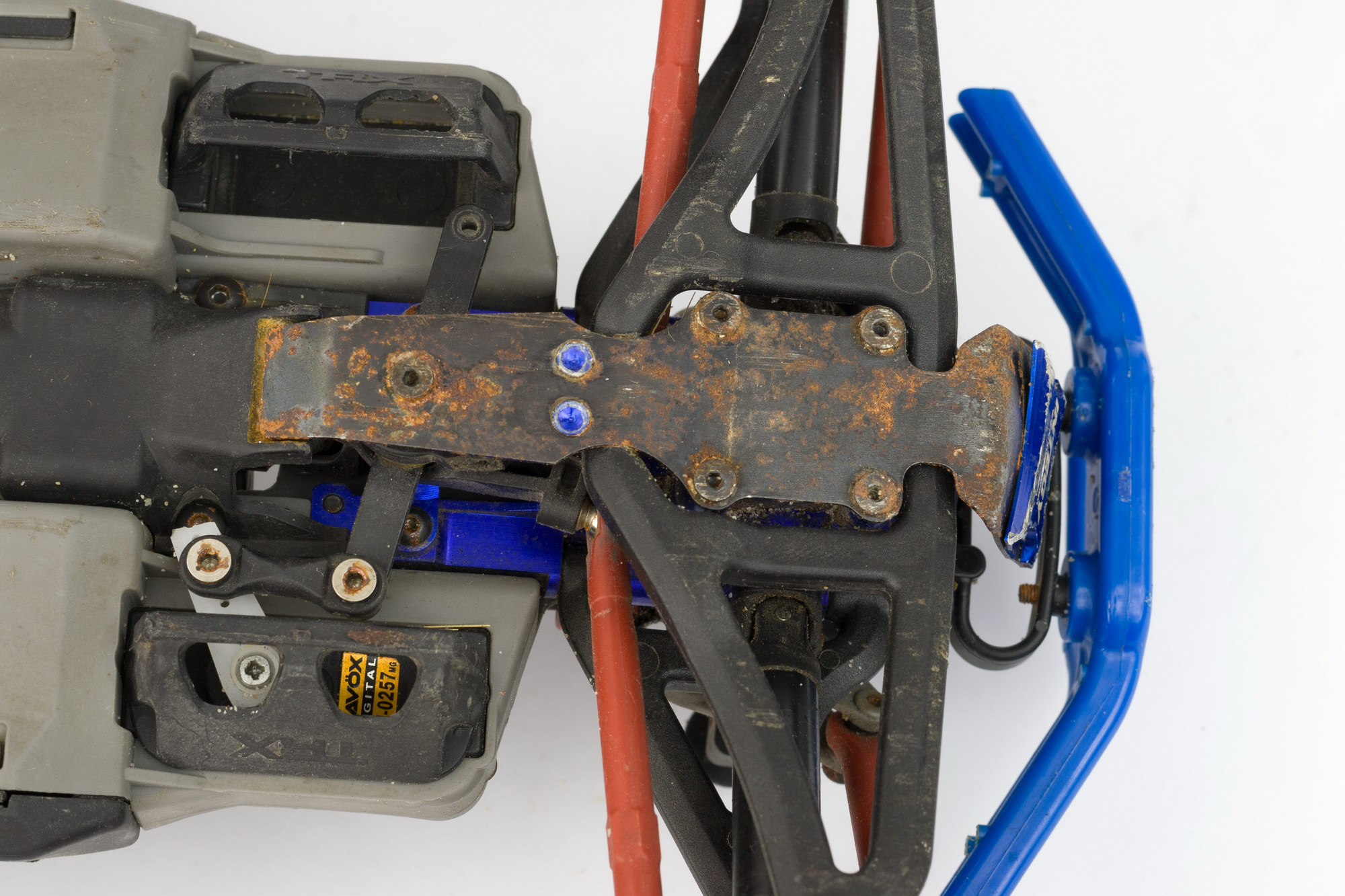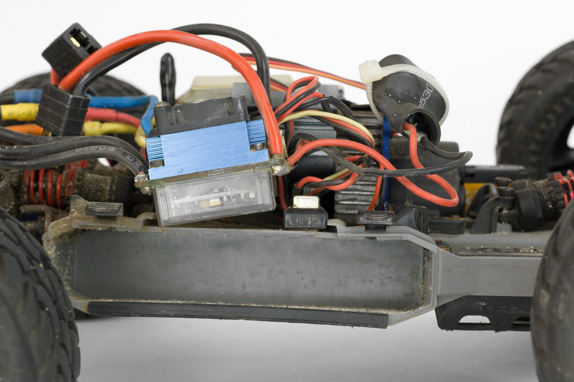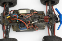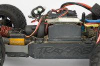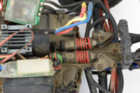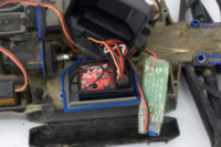 под крышкой приемника все чисто. еще зачем-то стоял внешний bec в режиме 6v. 6v это хорошо, но с такими маломощными мотором/esc и сервой смысла в нем особого не было, только лишние клубки проводов добавлял.