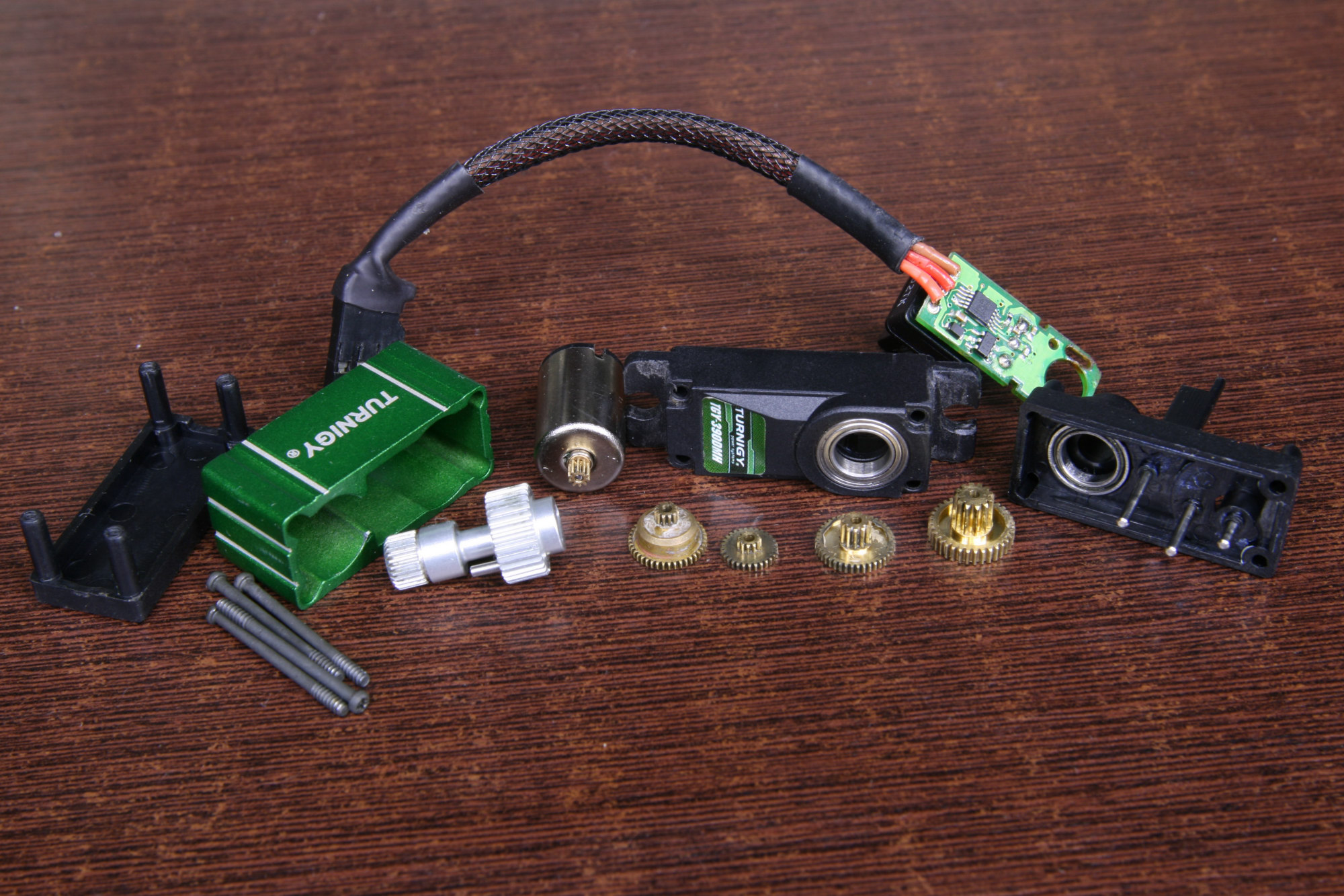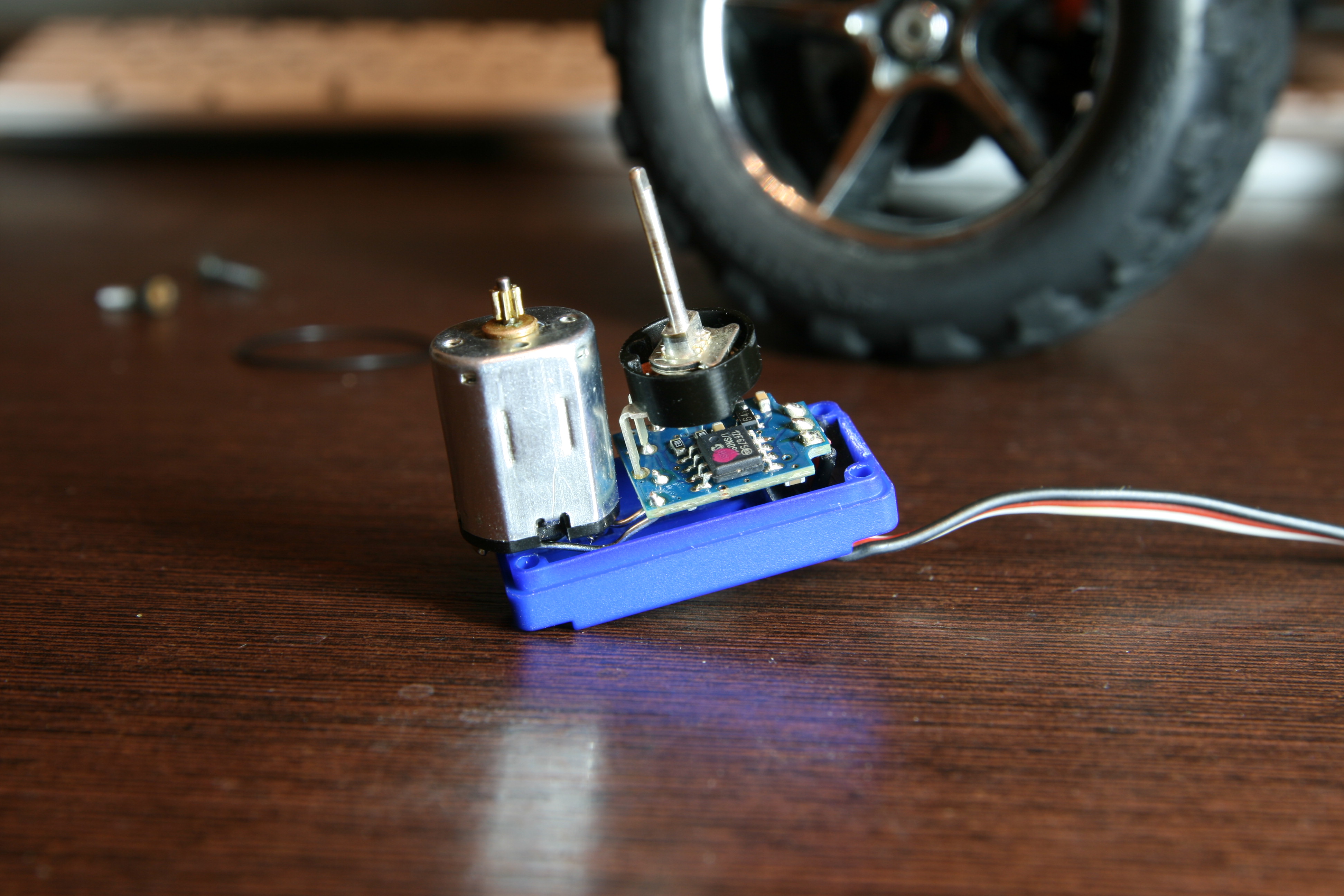 И всё таки отдала концы моя туринга 390-я. Разобрал мотор и Женя оказался прав, мотор там безсередечный (магниты внутри, а крутится только стаканчик из обмотки). У мотора с одной стороны сгорели щётки, возможно от того что серву клинило и был большой ток, а может просто износ. Щетки там тоненькие волосинки, поэтому не удивительно. К сожалению мотор по диаметру меньше, чем у других серв, поэтому всунуть другой мотор не получилось.