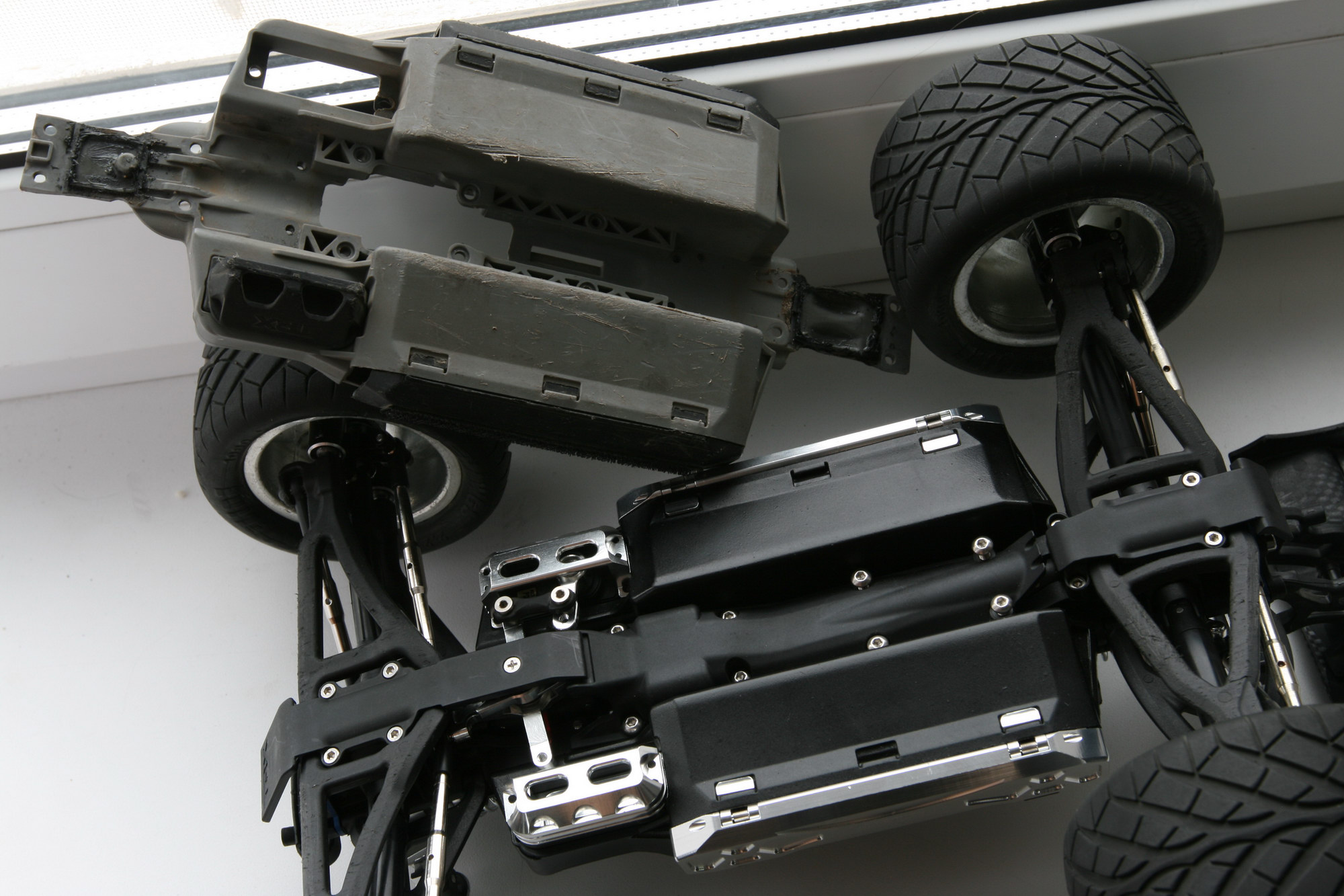 карбоновое шасси то как-то не внушает доверия, вот если б повторили форму родного из алюминия можно б было подумать, или хотяб те части где резьбы. на старом шасси помню пару болтов на честном слове держались, на новом пока держутся, но тоже до поры до времени. частых разобрал/собрал не выдержит пластик 😦