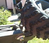 Сегодня был приятно удивлен, приложил своего монстрика на скорости 40-43км/ч об грузовую покрышку. Ну думаю вот и все, на свалку)) Колесо переднее отлетело в сторону вместе с потрохами. Собрал все отлетевшие запчасти (кость привода, рулевую тягу и собственно колесо со ступицей), принес в гараж на разбор полетов. Диагностика показала из сломанных узлов только каленая шпилька крепления кулака к рычагу. Весь пластик цел, тяги просто соскочили.