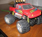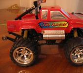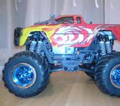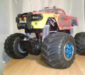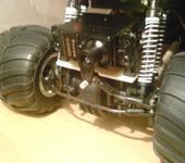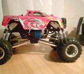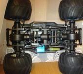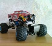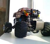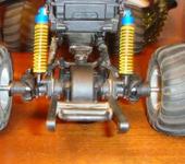 приветствую всех минимонстроводов:) тоже являюсь обладателем данной модели, принимайте в компанию:) Сам я из Магадана, осенью 2007 купил в питере монстрика, привез домой и вплоть до сегодняшнего дня он строится😵 модель выглядит как монстр2 но мосты стоят от первого. почти сразу после приезда домой сгорел стандартный мотор. т.к. гонять стало нечего, начитавшись этой ветки решил начать переделывать подвеску. удлинял родные рычаги с помощью антен, зубочисток, капроновой нити, суперклея и момента:) получилось достаточно надежно но неочень эстетично:P потом перенес рулевую серву на передний мост, соответсвенно задние колеса перестали быть управляемыми. пришлось изготавливать новые цельные полуоси для заднего моста, сделал их длинее для лучшей устойчивости модели. после нг пришли два новых двигателя 370 класса. поездил недолго умер регуль… новый регулятор привезли мне из питера в августе. покатался немного и умер аккум:) всю зиму монстрик стоял как экспонат на полке. и вот этим летом в первом открывшемся магазине р\у купил силовой акк и зарядку. гонял довольный целых пол часа потом неудачно приземлился на переднее колесо и сломал поворотный кулачек. на заднем мосту кулаки стояли уже сломанные(об мебель). долго искал фрезеровщика который возьмется изготовить кулачки из металла, взялись только на одном предприятии по 500 р. за шт. дядька сделал их из авиационнго дюраля, получился этакий эксклюзив😝поставил кулаки поездил еще пол часика и опять сгорел мотор, а потом второй. новый регулятор оказался слишком мощным для стандартных моторов. пришло время отпуска, а затем переезда в питер, в Одессе купил маслянные амортизаторы, полуоси от второго минимонстра(они длинее чем у первого,хочу удлинить чулок переднего моста) и антиопрокидыватель, в питере новый диф(в переднем мосту, в чашке диффа разбило гнездо для полуоси)