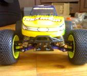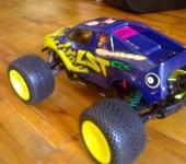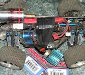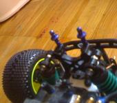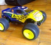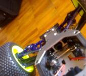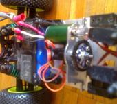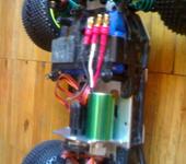 Я эксперимента ради пару дней назад поставил на Мини Кваку СЕ вместо штатного 380 коллекторника синий БК моторчик 3600 Kv с синей алюминиевой 13 зубов шестерней и самолетным БК контроллером 20А ГиперИон, питание от 3S лития 2.2 А*ч, снаряженный вес 790 грамм. Стартовый момент у самолетного БК контроллера как и ожидалось никакой, зато если тронулся - прелесть. При резком добавлении газа на скорости около 20 км/час устойчиво встает на дыбы на хорошо шершавом асфальте. Протектор на шинах уже никакой, вместо мелкого прыща ко мне едут дорожная резина, надеюсь она будет дольше вытираться. Максимум ГПС так и не мерял - и не зря - катание окончательно завершилось (после благополучной замены пары рычаг /кулак) наездом на большой скорости на камешек, который подбросил одну сторону, и машина кувыркалась поочерёдно касаясь асфальта всеми четырьмя конечностями не менее пяти оборотов с промежуточным подпрыгиванием. В результате сломало бронзовый шарик на тяге заднего колеса. При чем сломало его ниже шестигранника, теперь проблема выкрутить остатки. Придётся ждать задний бампер. Кстати на фото виден успешно опробованный самоклей из плотного поролона на месте заднего бампера. И угол антенны в 45 град к земле тоже оказался самый неломающийся.