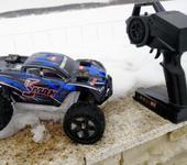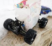 Немножко покатались с дочкой. На улице оттепель, моделька в сыром снегу совсем беспомощна) Откатали 3 аккума, проверили влагозащиту: всё ок) Только нужно на пакет обычную резинку найти, а то во всей квартире ничего не подошло)) Очень хороший накат дали чуть ослабленные корпуса дифференциалов: перестало закусывать и катится как следует. На пустых амортах скачет, как дрожки. Жду на неделе масляные аморты, зарядку и аккум на 3700мАч.