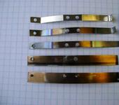 А пока сделал в запас рессоры для В1.Будильников в хозяйстве давно нет,достал пружину из механизма ремня безопасности от авто.Ширина 8мм,толщина 0,25.Пробил отверстия острым дюбельным гвоздём,с обратной стороны металл сточил болгаркой.Дальше,как писали выше в теме,сверлил алмазным шариком в воде,он уже не убегает. Лишние 3мм ширины тоже отрезал болгаркой.Концы полос отпустил в пламени и загнул.