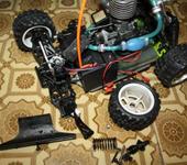 на начальной стадии были выточенны металлические чашки в замен пластика, потом серва на 6 кг(вроде),пак из пяти аккумов ААА, потом бак ставил большего обьема, накрылся двиган, попал подруки pro18(3.3куба) и пошел процесс… долго двиг не вставал как нужно выкинул пулстартер, сделал ротостартер от шуруповерта, бак заменил (тот что шел с двиглом на ssk v2) авария… замена амортов усилил деку верхним коркасом, от удара полелела колесная чашка… не долго думая выточил новые, но усиленные из 45х стали и закалил (теперь гайки не м3, а м4 (колессные)) новые шестигранники для новых дисков… хотя не много.