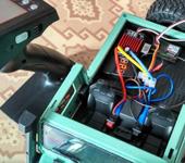Ну что. Электроника завелась. Машина поехала. Сервопривод Emax 3054 цифровой металл встал как родной, размеры один в один. Рулевую тягу собрал из стоковой временно, пока другие чашки поворотные не придут. Разрезал пополам стоковую длинную, отрезал от металл.тяги примерно 2 см и вставил в стоковую. Теперь можно регулировать. Короткая гнутая не пошла!!! На левую сторону по ходу движения, как типа она должна стоять, она не в состоянии повернуть колеса влево. Она просто поднимается вместе с качалкой. Поэтому из куска тяги, от которой уже откусил, как раз на правую сторону по ходу движения хватило с запасом. И уже не стал сгибать ее, прекрасно поворачивает в обе стороны. Пока разбираюсь, почему мотор назад крутит резвее чем вперед, от курка то правильно вперед едет, и после заднего хода вперед через двойной клик, где то я читал или смотрел про это. И как то небольшие рывки заметны, грешу на задний мост, надо попробовать перевернуть его, как в стоке должен быть. Электронику прятать некуда, её чего то много. Лежит в кузове, фото завтра, не за компом сейчас. Серва пытается на место встать, жужжит. Повыше на качалку что ли попробовать закрепить.