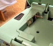 2 банки 18650 все же поместились по капот. Думал долго, сделал быстро. Вспомнил про волшебный двусторонний скотч. Еще понадобятся контакты от корпуса батареек, подойдут от АА. В наличии только один 18650, там на фото. Капот закрывается спокойно. Стекла вырезал канцелярским ножом из коробочек cd дисков, тонкий пластик которые называют. Клеил на супер клей-гель, не течет,удобно. Имитацию уплотнителя вокруг стекол покрасил черным перманентным маркером.