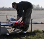 Первый полет без капота (ещё не покрашен) и без тапок. Взлет, пару щелчков по РВ, пару - по элеронам. На пятой минуте на “развороте на горке” перестал реагировать на ручку газа. Полетал пару минут, заглушил над полосой килл-свичем и еле посадил далеко и в траву. Как оказалось развалилось штатное гнездо для машинки газа ( а я так хорошо его приклеил). Ремонт в поле и ещё 4 полета по 10 минут. Во время крайней посадки лопнуло(сломалось) правое колесо на стыке плит. Результат: сломана карбоновая стойка, при капотировании треснул фонарь.