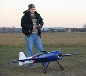 Есть такое дело, иногда по инерции проворачивает. Это потому, что он коротковат. В этом есть и плюс. Его можно прокрутить иногда так, что другим аппаратам и не снилось. Самолет по своему мне интересен, потому что не дает расслабится, имеет свой характер и при некотором опыте позволят выполнить практически все известные фигуры 3Д. За время полетов выявилась не только нехватка длины, но и недостаточная площадь руля направления. Правда я еще не игрался с центровкой. Сейчас она у меня где-то между стандартной и 3Д по инструкции, но судя по полетам можно еще назад сместить. Полетный вес (с топливом) 7800 гр. Тяжеловт вышел