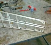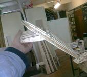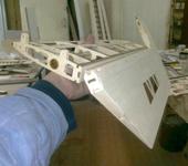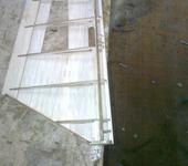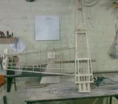 Вариан первый. Сегодня собирал, не очень мне понравился. Стенка набирается из отдельных элементов,из фанеры. Причём,рассчётный Ц/Т самолёта находится на трубе,лонжерон проходит снизу и сверху трубы. Крыло получилось достаточно лёгкое (310 гр, без обшивки),но … Собирать приходится от корневой нервюры, вверх, как пирамиду. Потом,на столе,ножками вниз, крыло выравнивается и зашивается.